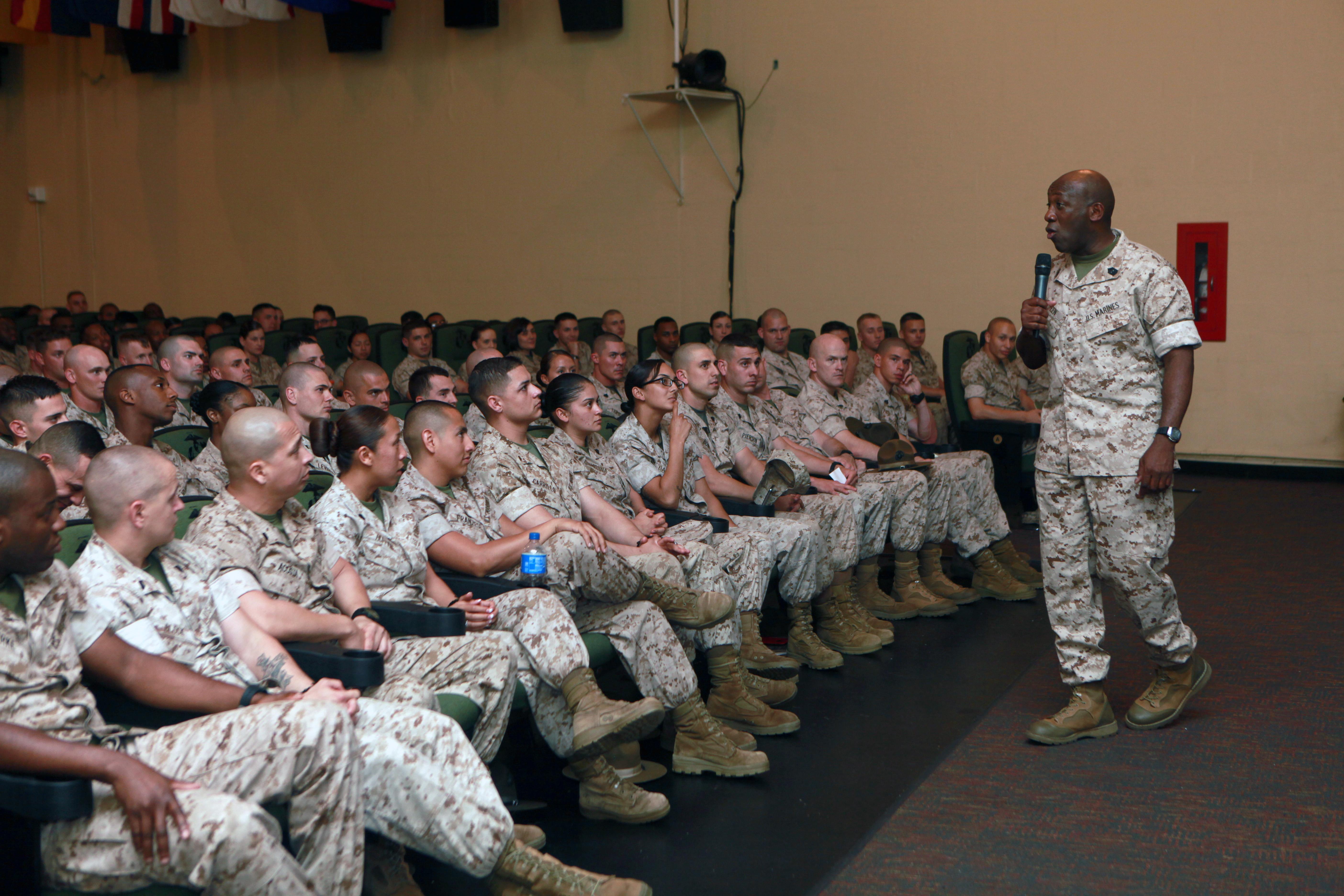 Sgt. Maj. Ronald L. Green, the 18th Sergeant Major of the Marine Corps, addresses Marines assigned to Marine Corps Base Quantico at the Little Hall Theater in Quantico, Va., April 11, 2015. (U.S. Marine Corps photo by Sgt. Marionne T. Mangrum)