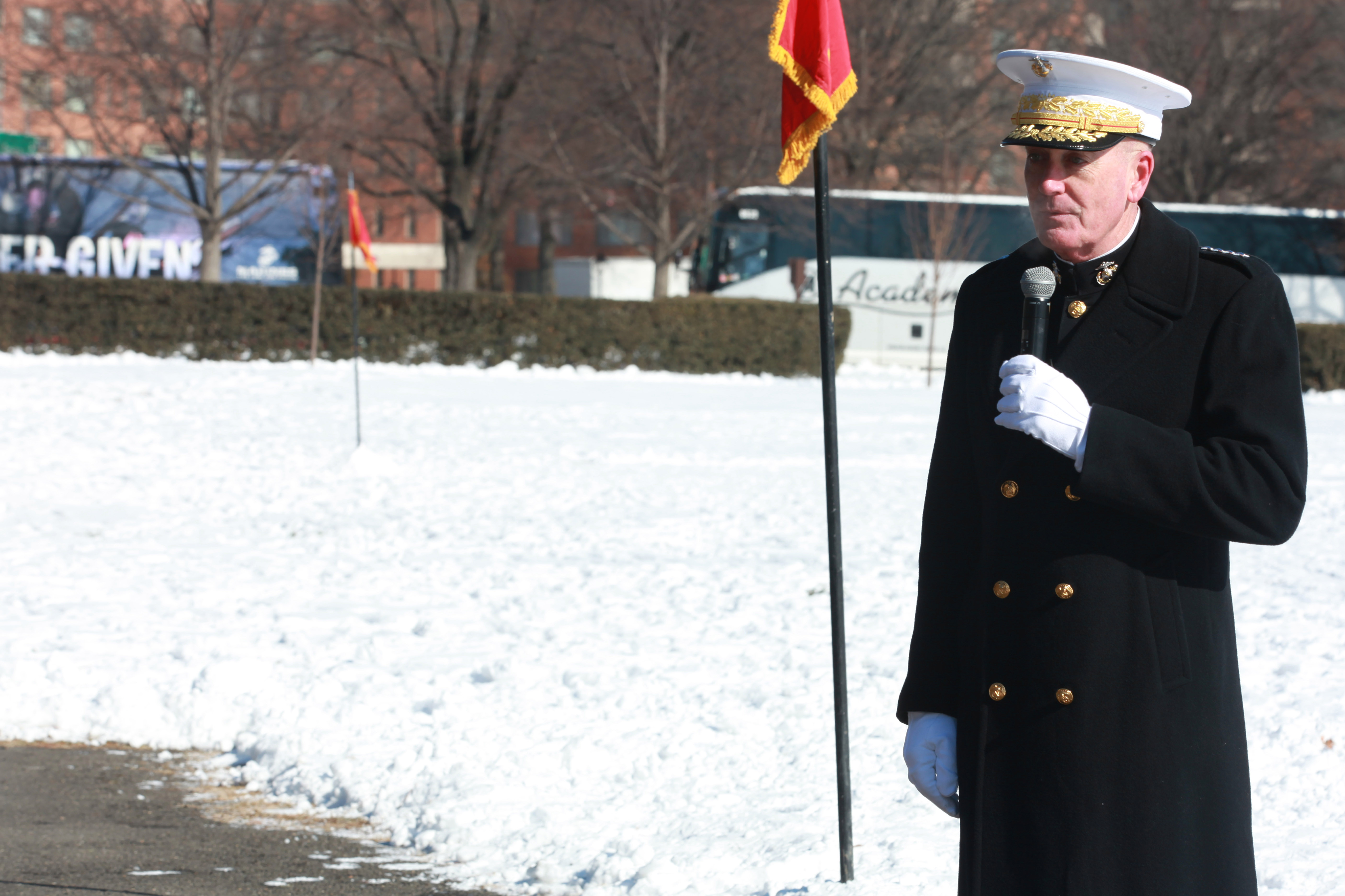 Gen. Joseph F. Dunford, the 36th Commandant of the Marine Corps hosts the Sergeant Major of the Marine Corps Relief and Appointment Ceremony at the Marine Corps War Memorial in Arlington, Va., Feb. 20, 2015. During the Ceremony Sgt. Maj. Micheal P. Barrett, the 17th Sergeant Major of the Marine Corps, retired and relinquished his post to Sgt. Maj. Ronald L. Green, the 18th Sergeant Major of the Marine Corps. (U.S. Marine Corps photo by Sgt. Marionne T. Mangrum.)