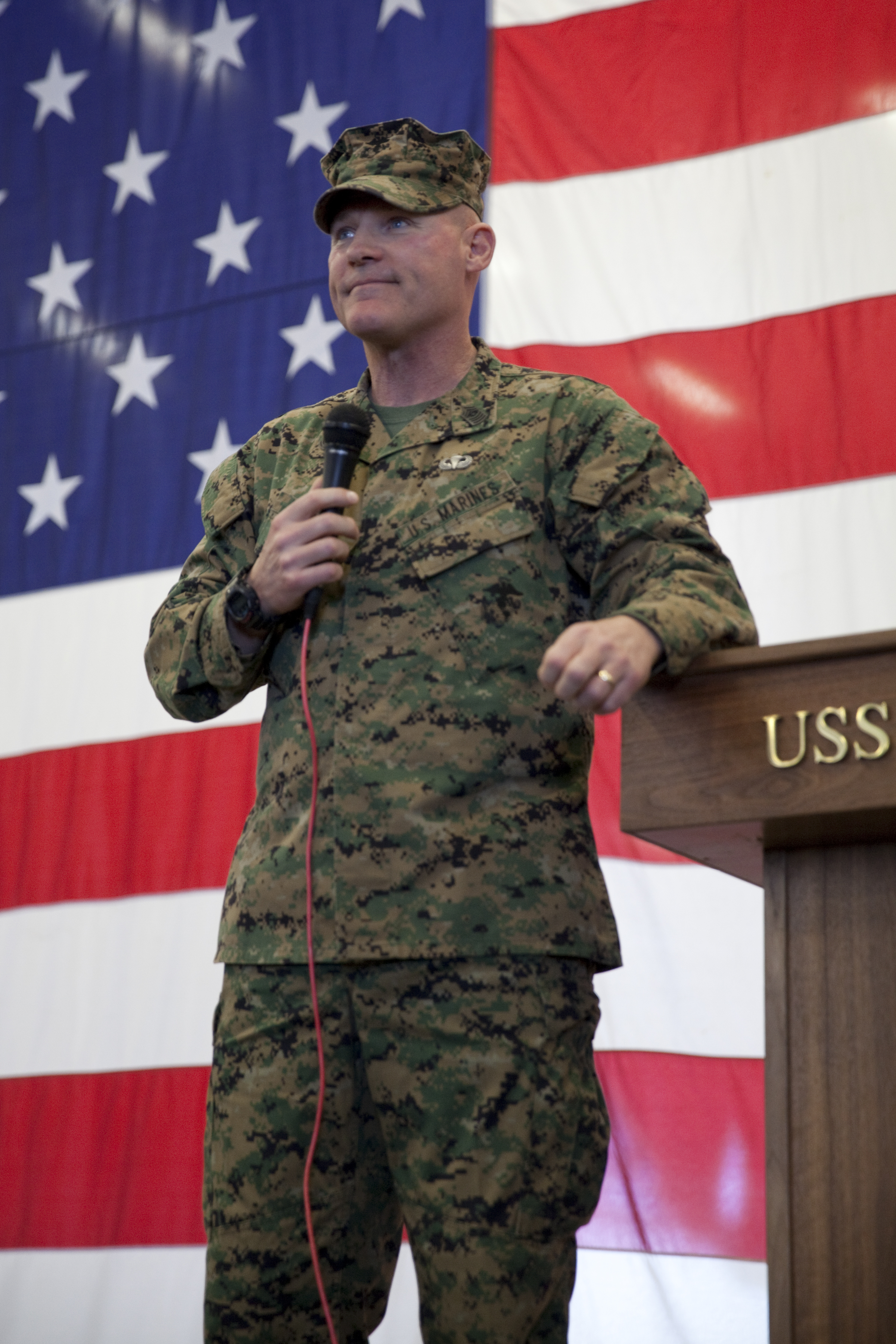 Sgt. Maj. Micheal P. Barrett, the 17th Sergeant Major of the Marine Corps, speaks to Marines and Sailors aboard the USS America (LHA-6), at Naval Base San Diego, Calif., on Jan. 5, 2015. (U.S. Marine Corps photo by Lance Cpl. Samantha K. Draughon/ Released)